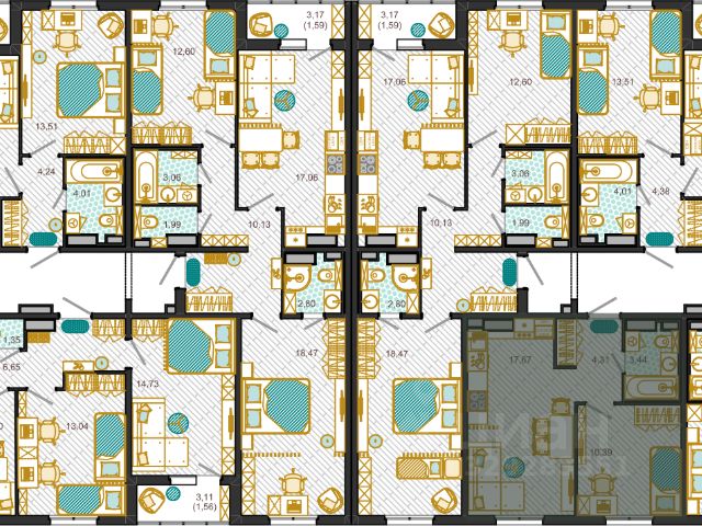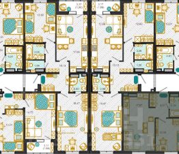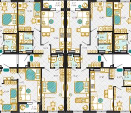 Наружные стены не являются несущими, конструктивная схема зданий - поперечно-стеновая. Фасады домов окрашены в разные цвета. В комплексе представлены однокомнатные, двухкомнатные и трехкомнатные квартиры общей площадью от 38 до 80 кв. м и с п