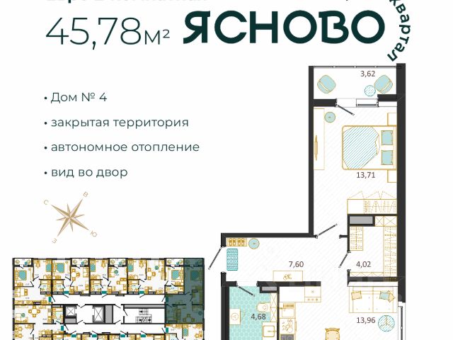 ЖК Ясново Дом 10 10-й дом продолжает развитие парк-квартала Ясново — современного, гармоничного пространства для жизни. Архитектура дома лаконична и выразительна, выдержана в общем стиле квартала и поддерживает его единый ритм и масштаб. На первом этаже расположатся магазины, уютные кафе и полезные сервисы — всё, что нужно рядом с домом. Закрытый двор без машин — безопасное и зелёное пространство для прогулок, встреч и отдыха. Жителям доступен привычный комфорт Ясново: современные детские площадки и зоны для отдыха благоустроенные пешеходные маршруты колясочная, санузел с лапомойкой на первом этаже собственная котельная и горячая вода круглый год. Квартира сдается в базовой отделке: готова стяжка пола и установлены счетчики, лоджии остеклены и заведен кабель для подключения интернета. Качественные металлические входные двери с надежной фурнитурой. Дополнительно вы можете выбрать любой вид отделки от застройщика — "whitе bох" или "whitе bох PRO" с полностью готовым санузлом, а также "под ключ" в стиле Утро или Вечер. 6-ой этаж