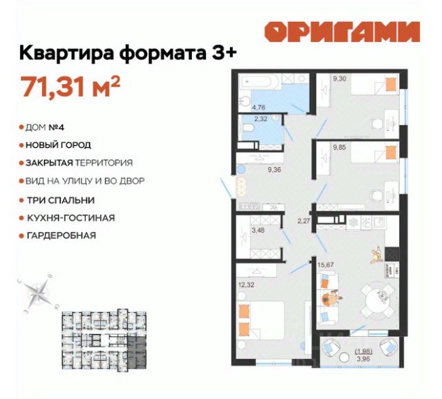 Продажа 3-комнатной квартиры в ЖК Оригами | Отделка на выбор | Закрытый двор Просторная 3 комнатная квартира в ЖК Оригами — идеальный вариант для семьи. Функциональная квартира с продуманной планировкой: три изолированные спальни и просторная кухня-гостиная, где удобно проводить время с семьей и принимать гостей. О квартире: — удобное зонирование: приватная зона (спальни) + общая зона (кухня-гостиная) — большая кухня - гостиная (евроформат) — увеличенные окна - отличная естественная освещенность — базовая отделка: стяжка пола, установлены счетчики — остекленная лоджия — заведён интернет-кабель — надежная металлическая входная дверь Важно: Вы можете выбрать вариант отделки, который подходит именно вам: — БЕЛЫЙ БОКС — БЕЛЫЙ БОКС (с готовым санузлом) — "под ключ" в стилях "Утро" или "Вечер" О доме: — современный подъезд с дизайнерской отделкой — колясочная и велосипедная, лапомойка для домашних питомцев — возможность приобрести кладовое помещение прямо на этаже Благоустройство: — закрытый двор с видеонаблюдением — двор без машин — продуманное зонирование территории: • березовая роща и зоны отдыха • площадки для спорта и активностей • беседки и прогулочные дорожки • детские площадки с безопасным покрытием • воркаут и спортивные зоны Инфраструктура: — магазин у дома — 12 образовательных и творческих школ — 5 детских садов — медицинский кластер — 7 торговых центров — парк "Прибрежный" рядом Отличный вариант для комфортной семейной жизни. Звоните! Расскажем подробнее и подберем лучший вариант!