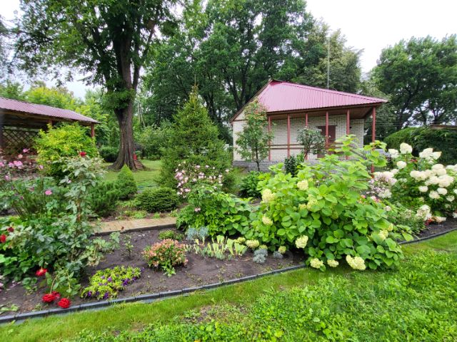 Отмостка вокруг дома 80см на 15см толщиной бетонная. Яблони , вишня, черешня, слива все плодоносит, большие деревья.