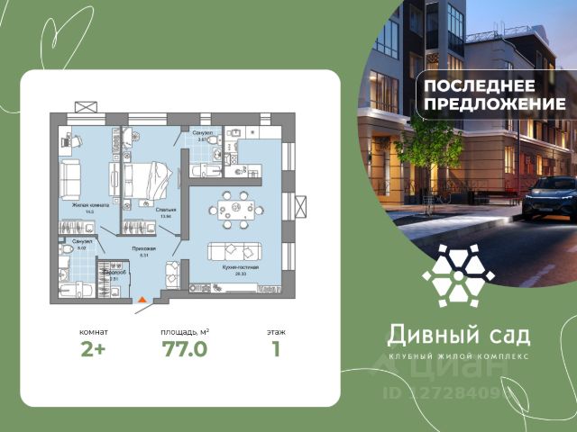 Последнее предложение! Звоните прямо сейчас! В уютном районе Ульяновска, рядом с парком Генерала Маргелова продается 2-комнатная квартира площадью 77.00 кв. м. Квартира находится на этаже дома номер 10 жилого комплекса "Дивный сад". Жизнь в окружении прекрасного, гармония с природой, соседство с людьми, разделяющими ваши ценности. У мечты есть адрес - клубный жилой комплекс "Дивный сад"! Философия архитектуры Клубный комплекс - это не только про высокий статус, но и про особую философию застройки нового формата, который теперь появился и в Ульяновске. Он создается в гармонии с окружающей средой, где преимущества частного дома сочетаются с комфортом привычной городской жизни. Дома строятся из надежного и экологичного кирпича. Такой материал выбран не случайно - кирпич высокого качества долговечен и морозоустойчив, в квартирах прекрасная шумоизоляция и всегда тепло. Японские панели- проверенный материал, который не выгорает до 25 лет. Фасады природных оттенков и фактур останутся такими же красивыми на долгие годы. Малоэтажные дома, на которые архитектора вдохновил уникальный стиль уютных европейских кварталов, обеспечивают приватную атмосферу для жителей клубного комплекса. А приятную атмосферу в вечерние часы дополнит декоративное освещение. Дивное место Ощущение дома за пределами квартиры - одна из главных задач, поставленная перед дизайнерами. Облик каждого подъезда наполнен теплом и красотой: отделка экологически чистыми материалами, мягкая удобная мебель, дизайнерские элементы и картины на стенах, умное освещение. С заботой о родителях и их детях в подъездах расположены специальные помещения, где удобно и безопасно хранить коляски, велосипеды, ролики или самокаты. Сад мечты в вашем дворе Двор мечты - это приватный зеленый уголок, где малыши могут играть на ярких площадках, спортсмены развивать и оттачивать навыки, а родители быть спокойными за безопасность своих детей. Основной принцип благоустройства - непрерывная связь с природой. Жители "Дивного сада" каждый день наслаждаются пейзажем из хвойных и лиственных деревьев, цветов и травяных полей. Расслабиться, почитать или поработать в тихой обстановке на свежем воздухе - больше не привилегия, а философия жизни в "Дивном саду". Квартиры в ипотеку в Ульяновске.