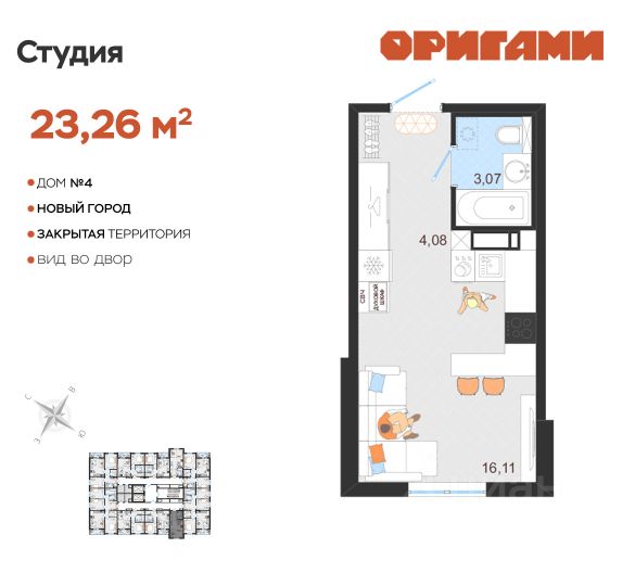 ЖК Оригами Старт продаж дома 4 Комфортная квартира с грамотной планировкой: разумное расположение комнат и просторная кухня гостиная. Сдается в базовой отделке: готова стяжка пола и установлены счетчики, лоджии остеклены и заведен кабель для подключения интернета. Качественные металлические входные двери с надежной фурнитурой. Дополнительно вы можете выбрать любой вид отделки от застройщика — "whitе bох" или "whitе bох PRO" с полностью готовым санузлом, а также "под ключ" в стиле Утро или Вечер. Современные и стильные подъезды с яркими дизайнерскими холлами и качественной отделкой. В каждом подъезде оборудованы просторные колясочные, велосипедные и лапомойки для домашних питомцев. Отдельно вы можете приобрести кладовое помещение на своем этаже для хранения сезонных вещей. Закрытый двор с видеонаблюдением, парковки за пределами двора, грамотное и продуманное зонирование: березовая роща, луг для активностей и пикников площадка для стритбола, столы для тенниса приватные беседки, сухой пляж с шезлонгами, пешеходные дорожки детские площадки с мягким и безопасным покрытием спортивные площадки, воркаут зоны для спорта Пространство с готовой инфраструктурой продуктовый магазин у дома 12 образовательных и творческих школ медицинский кластер 7 торговых центров 5 детских садов парк "Прибрежный" Квартира находится на 6 этаже в 1 подъезде