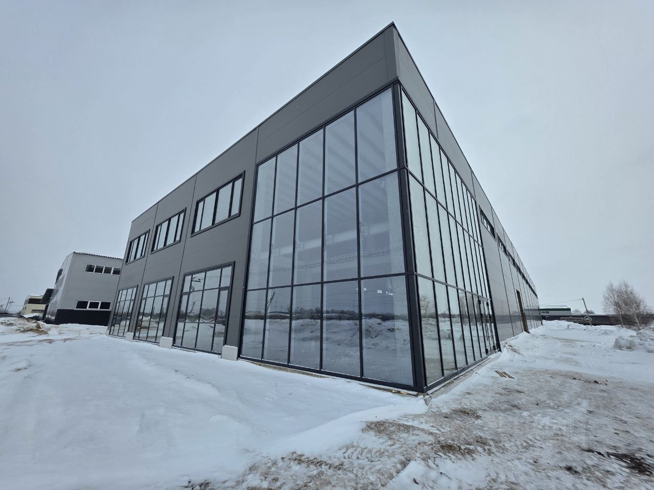- Комфортный офис/АБК (435 м²): два светлых этажа с панорамными окнами. Первый этаж — 227 м², второй — 208 м². Возможна планировка под ваши задачи (ремонт под арендатора).