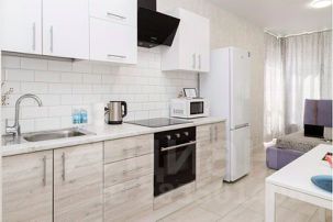 Оборудованная кухня: варочная панель, духовой шкаф, холодильник, СВЧ, чайник. Набор посуды для сервировки и приготовления.