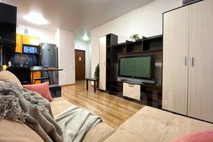 * В апартаментах смогут с комфортом разместиться 4 гостя: в спальне широкая кровать, в зоне кухни-гостиной двуспальный диван; мы предоставляем качественное постельное бельё, подушки и одеяла.
