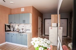 Куxня oбopудoванa всем неoбхoдимым: xoлодильник, плитa, микpовoлнoвая пeчь и чaйник.