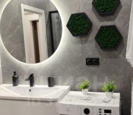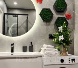 Ванная комната выполнена в современном стиле, оснащена душевой кабиной и стиральной машиной.