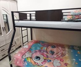 В квартире есть частично мебель. Косметический ремонт. В кухне площадью 18 кв. м установлена мебель и техника, включая холодильник и кондиционер.В жилой комнате стоит двухъярусная кровать снизу двухместная, шкаф, полка. Санузел совмещённый, оборудован ванной.
