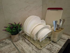 На кухне есть всё необходимое для приготовления любимых блюд: плита, холодильник, духовка, вытяжка, микроволновая печь, электрический чайник и набор посуды.