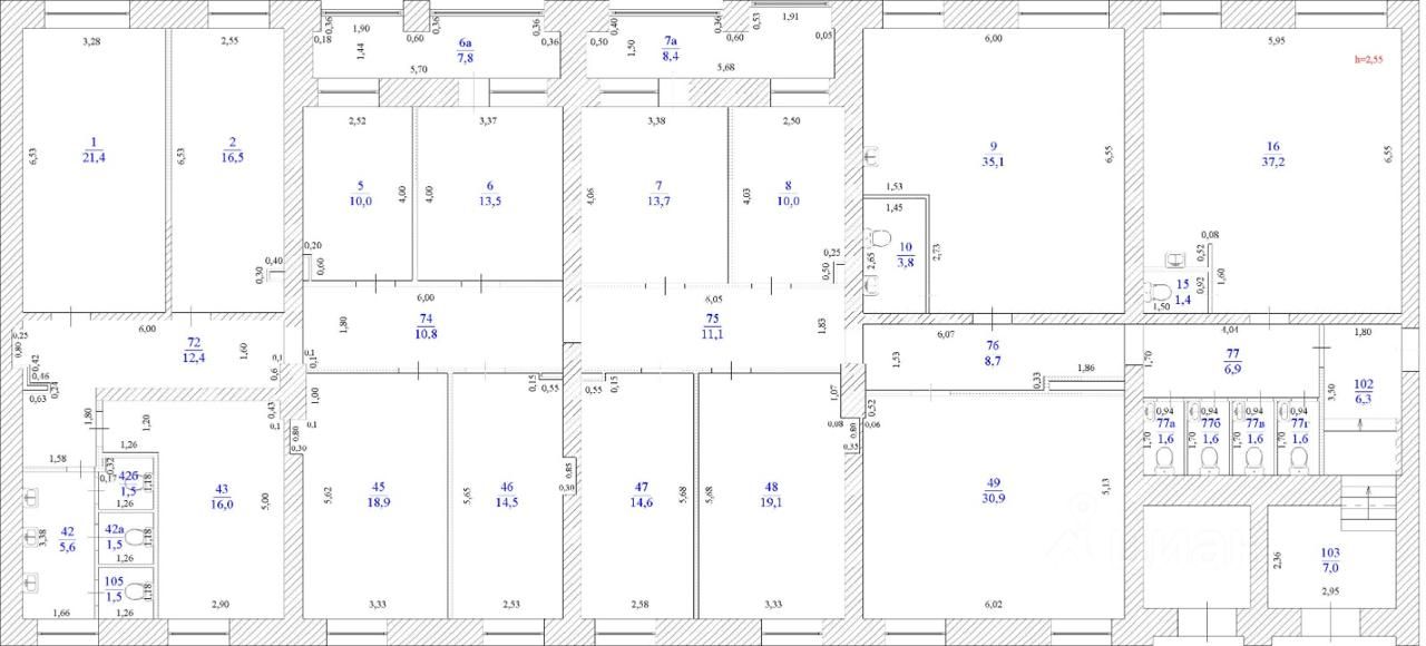 В помещении свежий стильный ремонт, новые двери, светильники, новая сантехника. Планировка кабинетная, 14 кабинетов площадью от 10 до 37 кв.м. 9 санузлов, 2 просторные лоджии. Во всех кабинетах окна.