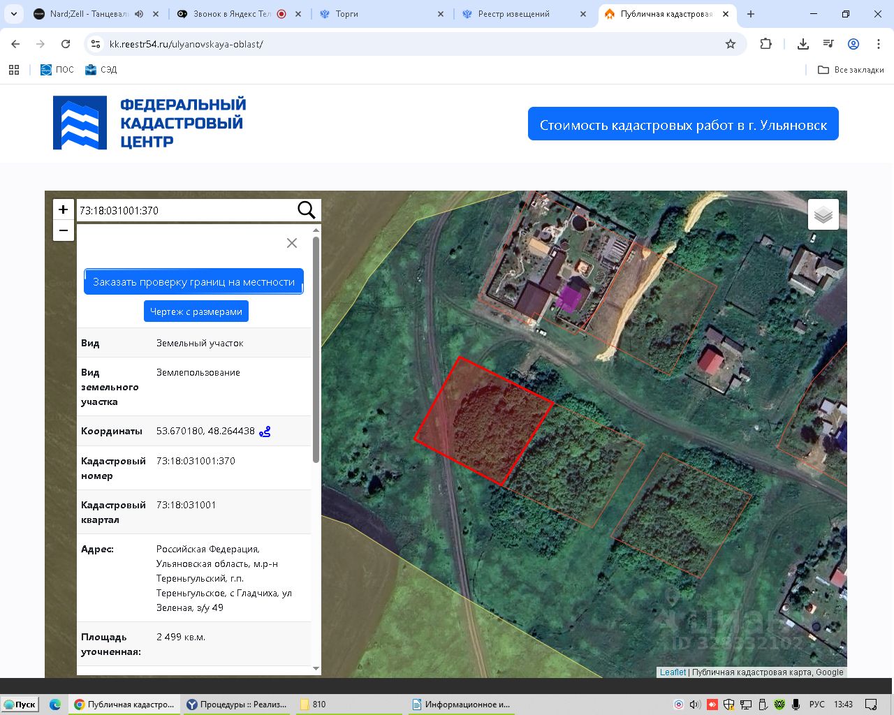 Земельный участок с кадастровым номером 73:18:031001:370 площадь 2499 по адресу Российская Федерация, Ульяновская область, м.р-н Тереньгульский, г.п. Тереньгульское, с Гладчиха, ул Зеленая, з/у 49