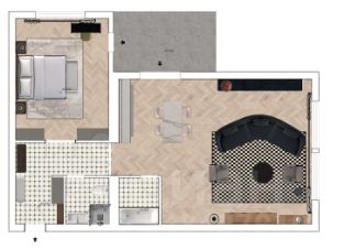 Помещение состоит из просторной кухни-гостиной, где можно организовать комфортное место для отдыха и общения. Здесь также предусмотрена возможность выделения дополнительной комнаты, что делает пространство еще более функциональным. Вторая комната меньшего размера идеально подойдет для спальни или кабинета. Просторный коридор добавляет ощущение свободы и легкости.