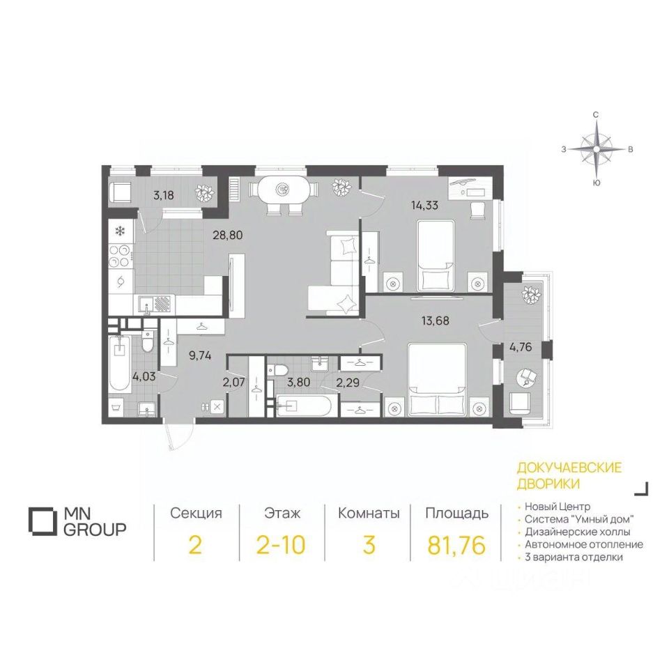 Продаётcя 3-комн. квартира квaртиpа на 2 этaже квартала MN Group "Докучаевские дворики".