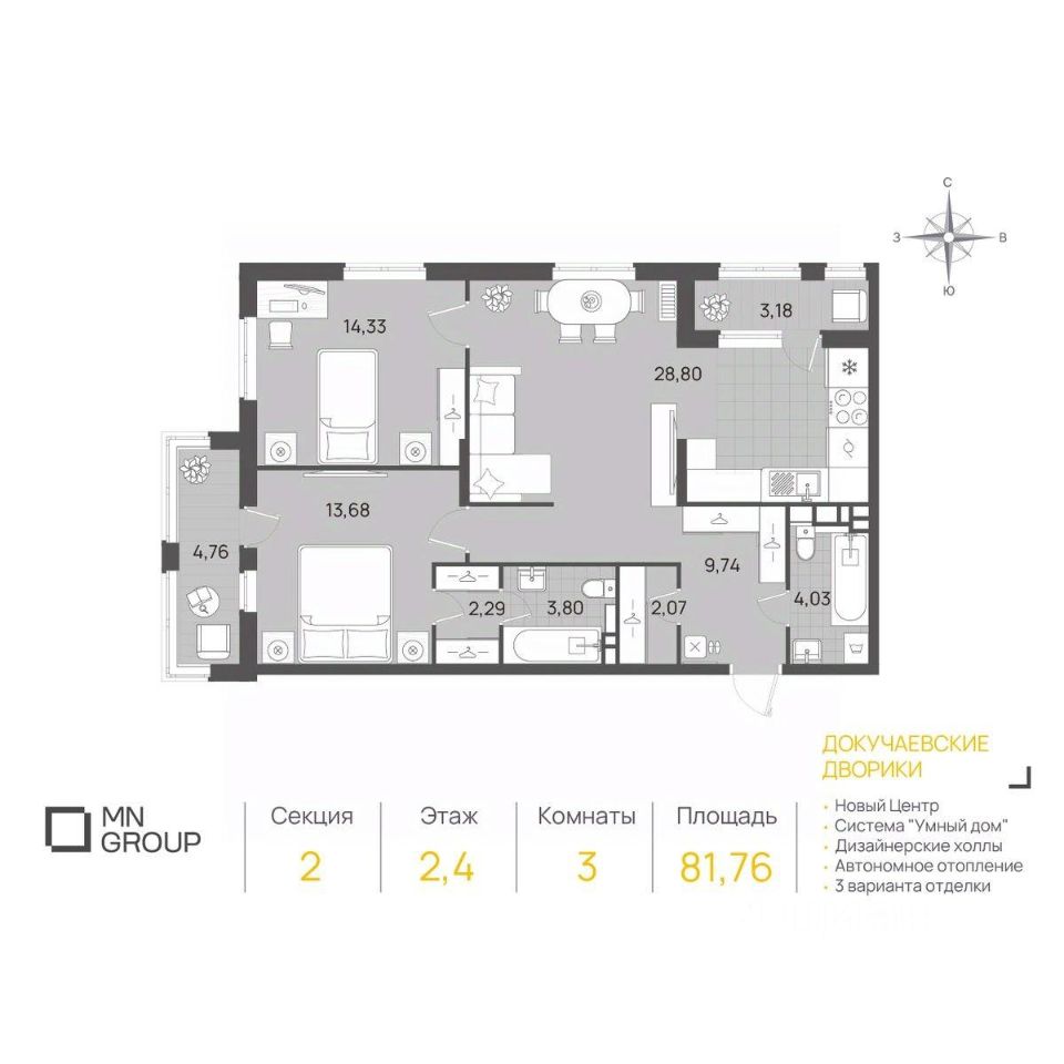 Купить данную квартиру в квартале "Докучаевские дворики" можно напрямую от застройщика "MN Group":