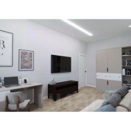 В жилых комнатах установлены двери с покрытием из эмали, декорированные фактурной филенкой. Натяжные потолки с теневым профилем и мягкими световыми линиями добавляют неожиданных акцентов в геометрии.