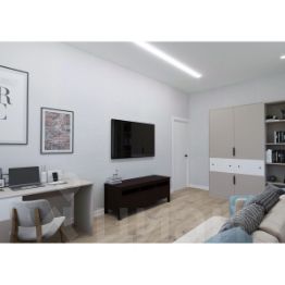В жилых комнатах установлены двери с покрытием из эмали, декорированные фактурной филенкой. Натяжные потолки с теневым профилем и мягкими световыми линиями добавляют неожиданных акцентов в геометрии.