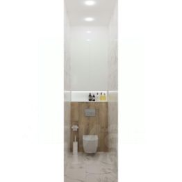 Санузел оформлен коллекционным крупноформатным керамогранитом, матовая и акцентная плитка подчеркивает индивидуальность вашего интерьера. В ванной устанавливается современная сантехника: акриловая ванна с экраном, выложенным плиткой, тропический душ с режимом аквамассажа, подвесная тумба со встроенной раковиной и электрический полотенцесушитель. Эргономичное зеркало-шкаф обеспечивает компактное хранение без визуального шума. Инсталляция, размещенная над полом, скрывает все лишнее и добавляет легкости интерьеру.
