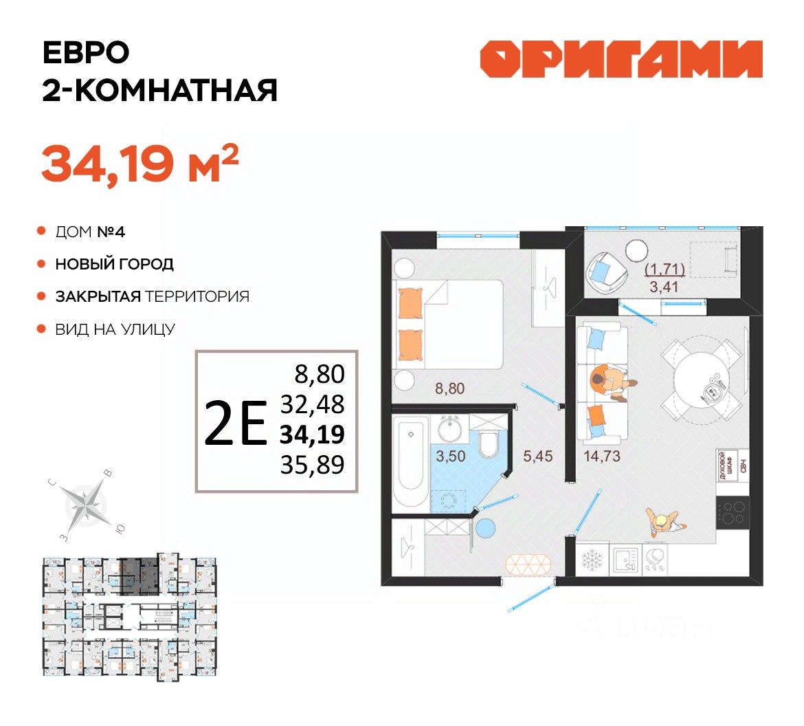 ЖК Оригами Старт продаж дома 4 Комфортная квартира с грамотной планировкой: разумное расположение комнат и просторная кухня гостиная. Сдается в базовой отделке: готова стяжка пола и установлены счетчики, лоджии остеклены и заведен кабель для подключения интернета. Качественные металлические входные двери с надежной фурнитурой. Дополнительно вы можете выбрать любой вид отделки от застройщика — "whitе bох" или "whitе bох PRO" с полностью готовым санузлом, а также "под ключ" в стиле Утро или Вечер. Современные и стильные подъезды с яркими дизайнерскими холлами и качественной отделкой. В каждом подъезде оборудованы просторные колясочные, велосипедные и лапомойки для домашних питомцев. Отдельно вы можете приобрести кладовое помещение на своем этаже для хранения сезонных вещей. Закрытый двор с видеонаблюдением, парковки за пределами двора, грамотное и продуманное зонирование: березовая роща, луг для активностей и пикников площадка для стритбола, столы для тенниса приватные беседки, сухой пляж с шезлонгами, пешеходные дорожки детские площадки с мягким и безопасным покрытием спортивные площадки, воркаут зоны для спорта Пространство с готовой инфраструктурой продуктовый магазин у дома 12 образовательных и творческих школ медицинский кластер 7 торговых центров 5 детских садов парк "Прибрежный" Квартира находится на 12 этаже в 1 подъезде