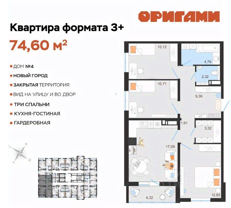 ЖК Оригами Старт продаж дома 4 Комфортная квартира с грамотной планировкой: разумное расположение комнат и просторная кухня гостиная. Сдается в базовой отделке: готова стяжка пола и установлены счетчики, лоджии остеклены и заведен кабель для подключения интернета. Качественные металлические входные двери с надежной фурнитурой. Дополнительно вы можете выбрать любой вид отделки от застройщика — "whitе bох" или "whitе bох PRO" с полностью готовым санузлом, а также "под ключ" в стиле Утро или Вечер. Современные и стильные подъезды с яркими дизайнерскими холлами и качественной отделкой. В каждом подъезде оборудованы просторные колясочные, велосипедные и лапомойки для домашних питомцев. Отдельно вы можете приобрести кладовое помещение на своем этаже для хранения сезонных вещей. Закрытый двор с видеонаблюдением, парковки за пределами двора, грамотное и продуманное зонирование: березовая роща, луг для активностей и пикников площадка для стритбола, столы для тенниса приватные беседки, сухой пляж с шезлонгами, пешеходные дорожки детские площадки с мягким и безопасным покрытием спортивные площадки, воркаут зоны для спорта Пространство с готовой инфраструктурой продуктовый магазин у дома 12 образовательных и творческих школ медицинский кластер 7 торговых центров 5 детских садов парк "Прибрежный" Квартира находится на 12 этаже в 1 подъезде