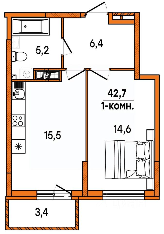 Продаётся 1-комнатная квартира в строящемся доме (дом 6), срок сдачи: IV-кв. 2027, общей площадью 42.7 кв.м., на 9 этаже. Расположение, транспортная доступность