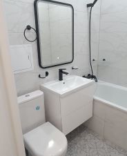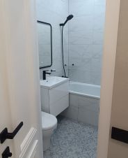 Ванная комната выложена керамогранитом. Все трубы (вода, канализация) проведены внутри стен. Санузел укомплектован максимально!