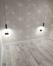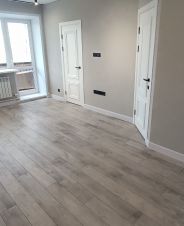 На полах качественный стильный ламинат серого цвета с фаской, уложен по всем комнатам единым ковром без стыков и порогов.