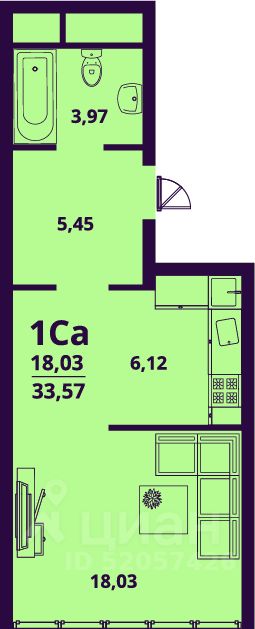 Продаётся 1-комнатная квартира в сданном доме (Народного учителя Латышева, 7), срок сдачи: IV-кв. 2023, общей площадью 33.57 кв.м., на 22 этаже.