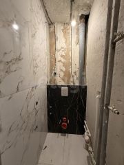 Особого внимания заслуживают каменные подоконники из кварцевого агломерата, демонстрирующие внимание к деталям. Раздельный санузел почти полностью завершен: уложен керамогранит, установлена инсталляция GROHE и готова к монтажу стеклянная дверь для душевой кабины.