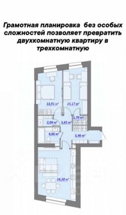 Просторная двухкомнатная квартира , в случае необходимости, может быть успешно трансформирована в трехкомнатную.
