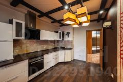 Кухня оборудована встроенной мебелью и техникой: варочная панель Simens и духовой шкаф Simens, вытяжка.Своеобразным дополнением в дизайне кухни являются декоративные полки и группа светильников.