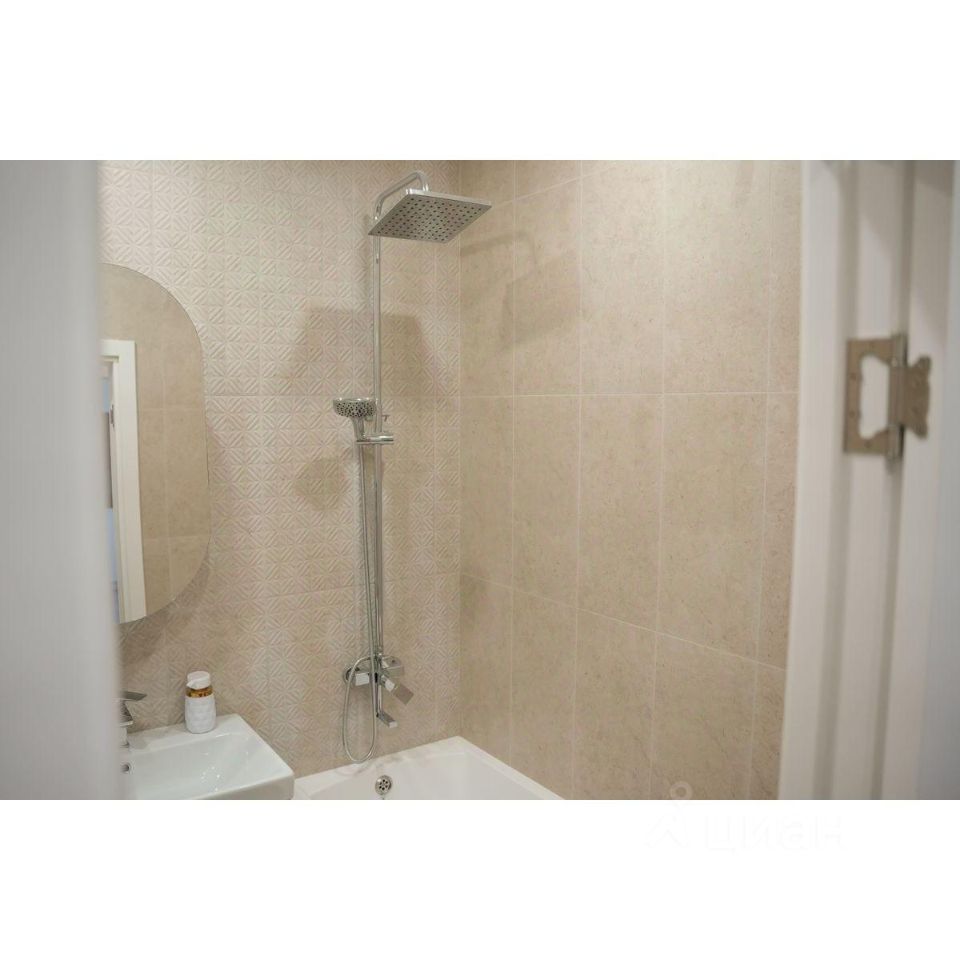 Санузел оформлен коллекционным крупноформатным керамогранитом, матовая и акцентная плитка подчеркивает индивидуальность вашего интерьера. В ванной устанавливается современная сантехника: акриловая ванна с экраном, выложенным плиткой, тропический душ с режимом аквамассажа, подвесная тумба со встроенной раковиной и электрический полотенцесушитель. Эргономичное зеркало-шкаф обеспечивает компактное хранение без визуального шума. Инсталляция, размещенная над полом, скрывает все лишнее и добавляет легкости интерьеру.