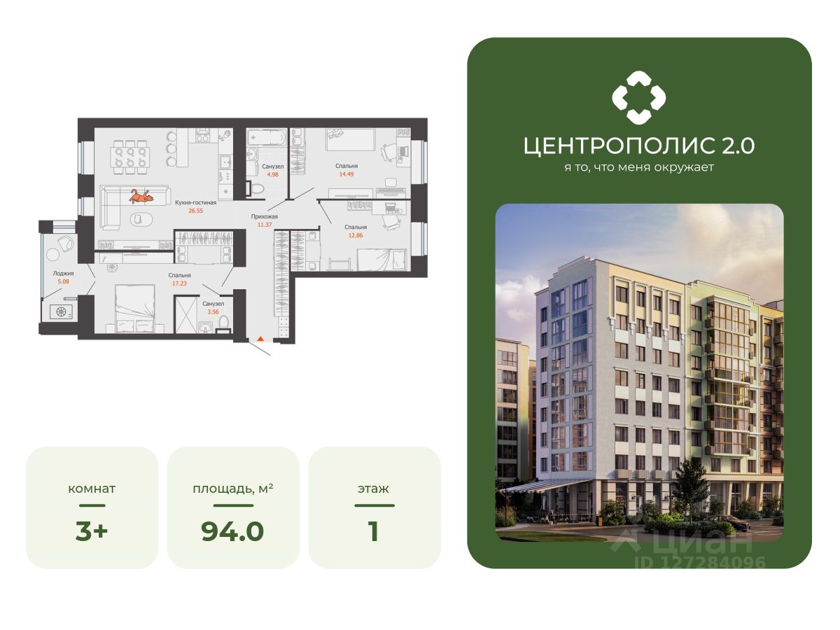 В Заволжском районе Ульяновска продается 3-комнатная квартира площадью 94.00 кв. м. Квартира расположена на 1 этаже 9 корпуса в жилом комплексе CENTROPOLIS 2.0 ("Центрополис 2.0").