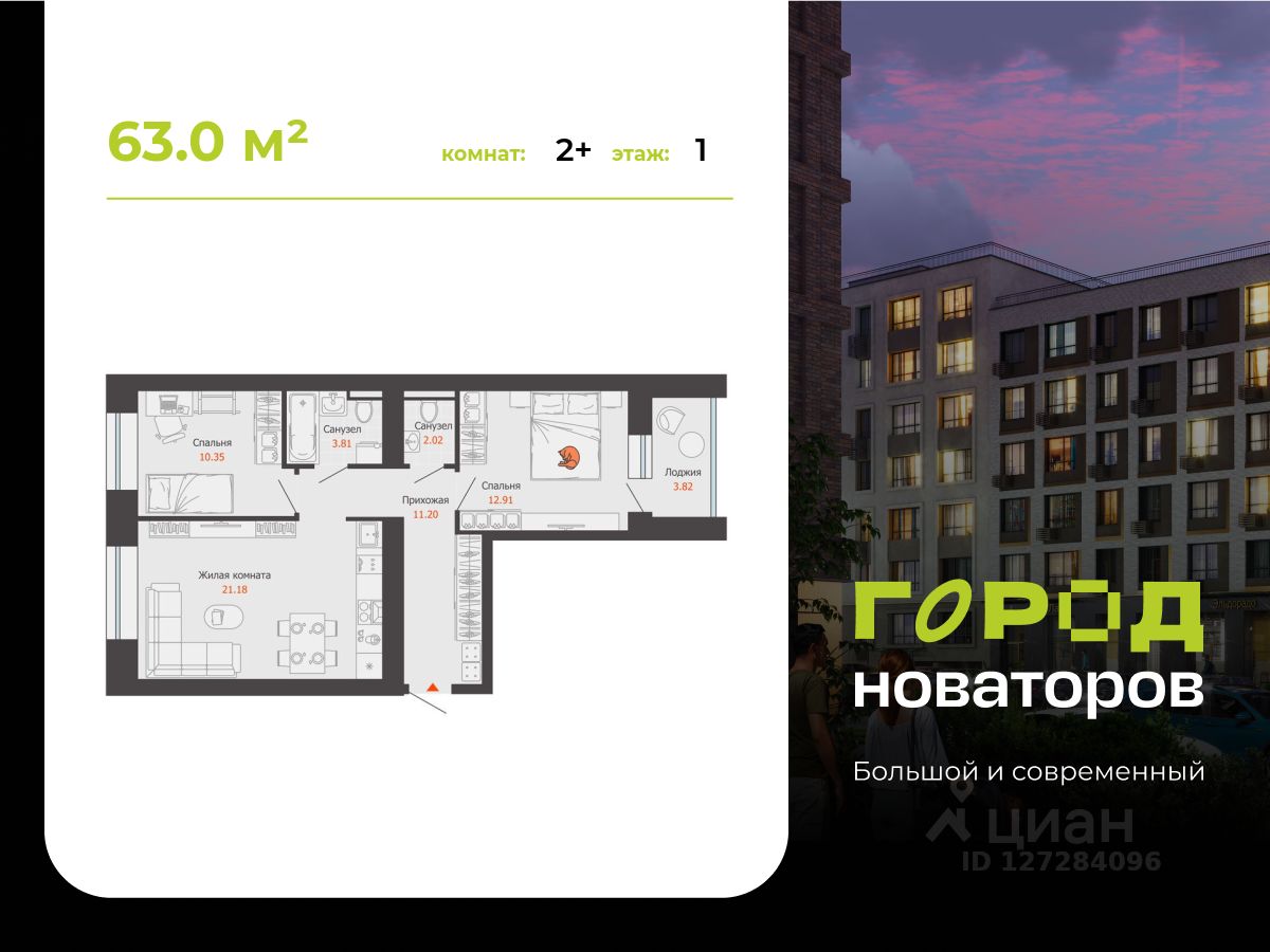 В продаже 2-комнатная квартира площадью 63.00 кв. м в жилом комплексе "Город новаторов" в Ульяновске.