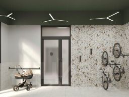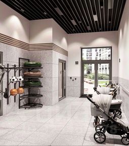 В подъездах предусмотрены колясочные и велосипедные, а также лапомойки для домашних животных.