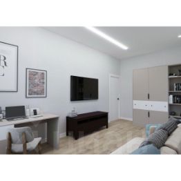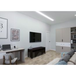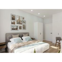 Санузел оформлен коллекционным крупноформатным керамогранитом, матовая и акцентная плитка подчеркивает индивидуальность вашего интерьера. В ванной устанавливается современная сантехника: акриловая ванна с экраном, выложенным плиткой, тропический душ с режимом аквамассажа, подвесная тумба со встроенной раковиной и электрический полотенцесушитель. Эргономичное зеркало-шкаф обеспечивает компактное хранение без визуального шума. Инсталляция, размещенная над полом, скрывает все лишнее и добавляет легкости интерьеру.