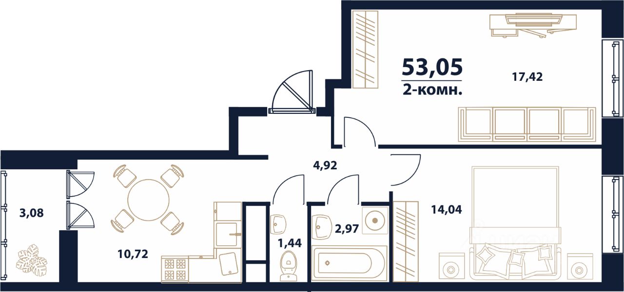 Продаётся 2-комнатная квартира в строящемся доме (дом 5), срок сдачи: I-кв. 2026, общей площадью 53.05 кв.м., на 11 этаже.