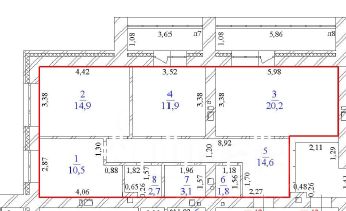14,9 кв. м, 11,9 кв. м и 10,5 кв. м. Кухня- 11,8 кв. м с выходом на застекленный балкон.