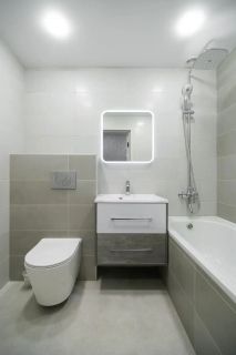 Санузел отделан светлой кафельной плиткой, вся сантехника и система отопления заменены на новые, что гарантирует надежность и комфорт в эксплуатации.