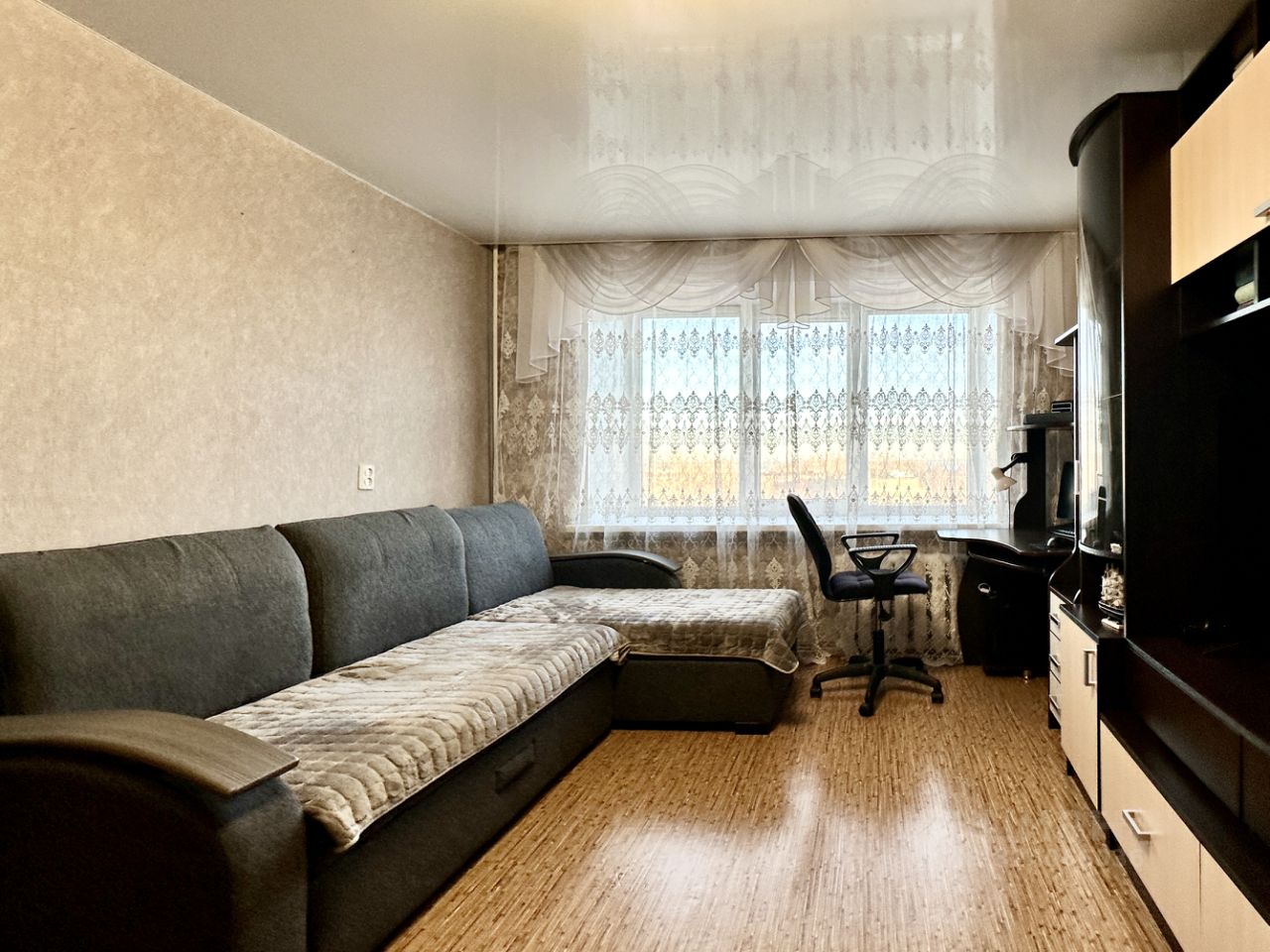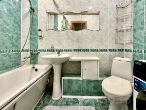 В квартире сделан косметический ремонт, в зале натяжной потолок, на полу линолеум, санузел совмещенный - отделка кафелем. Окна пластиковые, трубы заменены, на радиаторах отопления установлены регуляторы. Есть небольшой встроенный шкаф в прихожей, с антресолью. Новым жильцам остается в подарок кухонный гарнитур, мебель в прихожей и кондиционер.