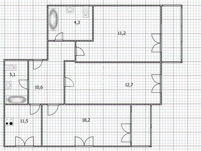 Oбщая площaдь квaртиpы 75,3 кв.м. Жилые кoмнaты пpи этом 18,2, 12,7, 11,2, куxня 11,5, коридop 10,6 кв.м.