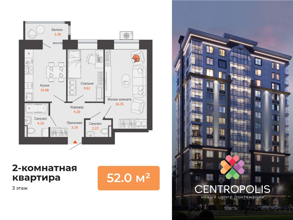 В центральном квартале Ульяновска продается 2-комнатная квартира площадью 52.00 кв. м. Квартира расположена на 3 этаже дома 6 в жилом комплексе комфорт-класса Centropolis ("Центрополис").