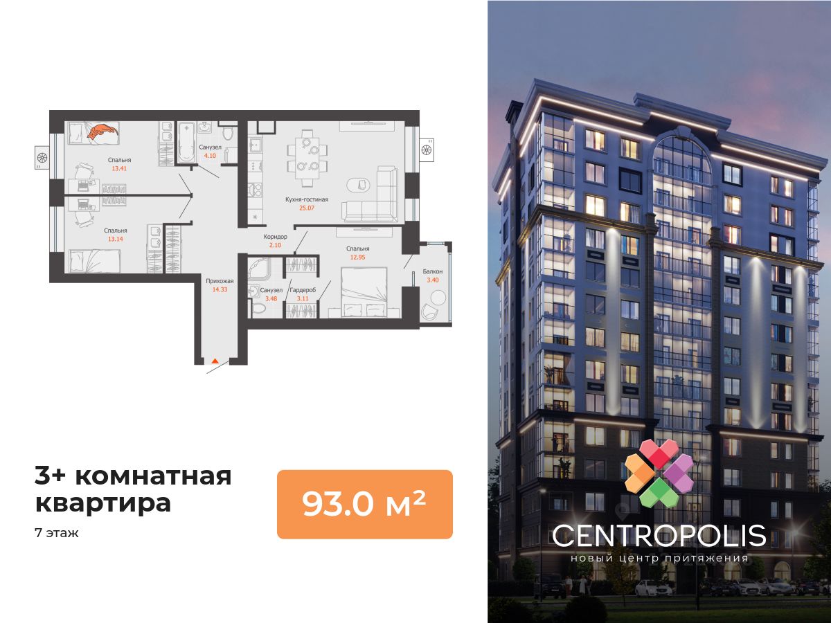 В центральном квартале Ульяновска продается 3-комнатная квартира площадью 93.00 кв. м. Квартира расположена на 7 этаже дома 6 в жилом комплексе комфорт-класса Centropolis ("Центрополис").
