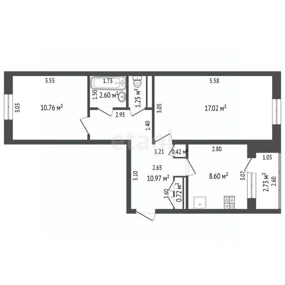 уютная спальня 10.76 кв м и кухня 8.6 кв м с практичным выходом на застекленную лоджию.
