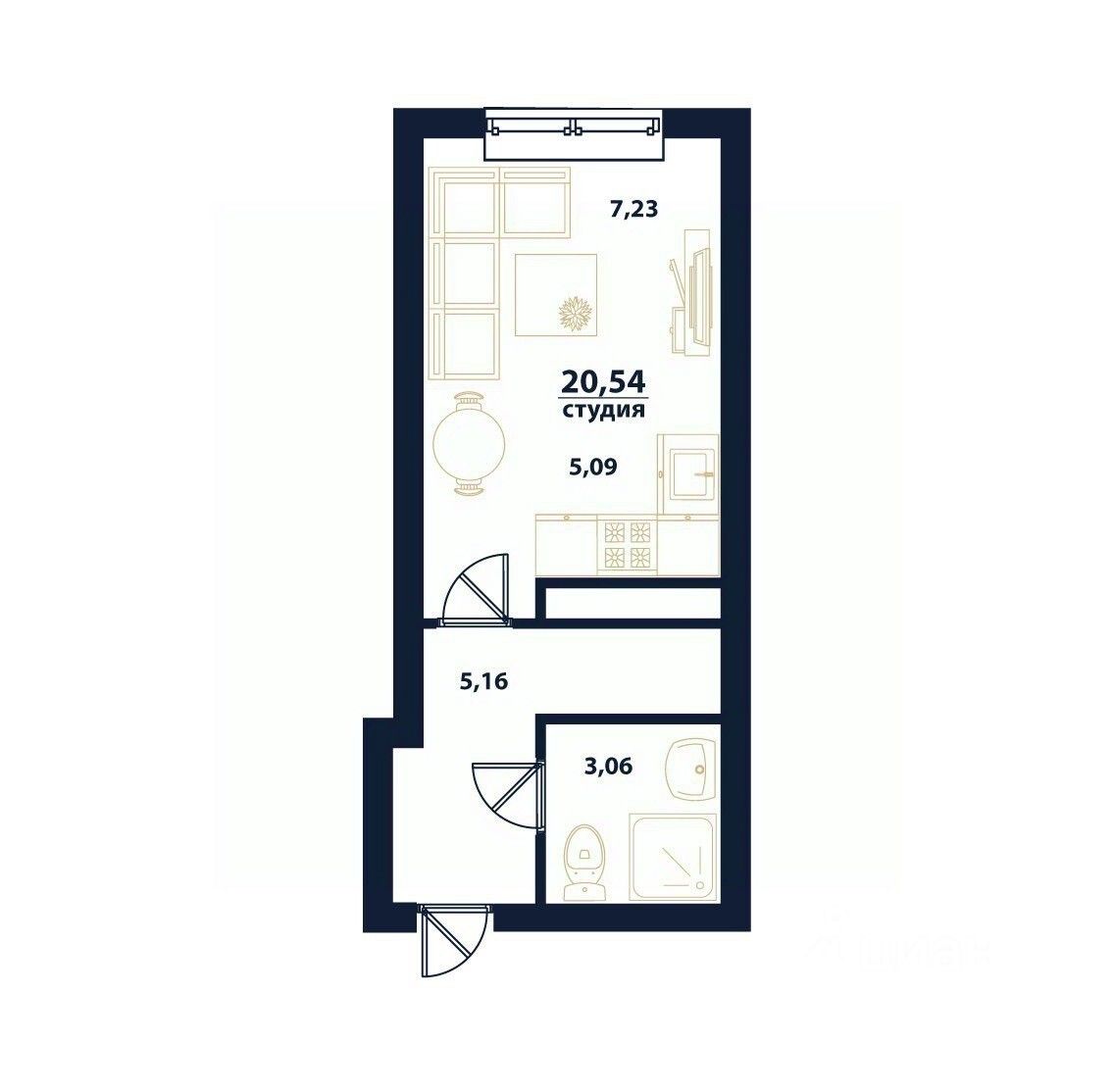Продаётся 1-комнатная квартира в строящемся доме (дом 5), срок сдачи: I-кв. 2026, общей площадью 20.54 кв.м., на 6 этаже.
