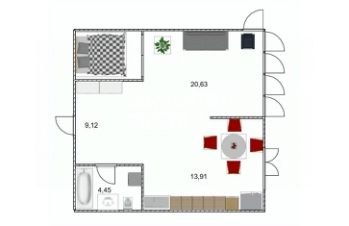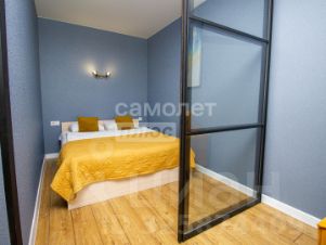 Общая площадь квартиры 48 кв.м. Жилая комната при этом 20 кв.м., кухня - 12 кв.м., коридор - 9 кв.м. Кухня совмещена с гостиной — пространство наполняется светом и выглядит визуально больше. Спальная зона отделена стеклянными перегородками, что сохраняет приватность и визуальную лёгкость. В коридоре установлен встроенный шкаф.