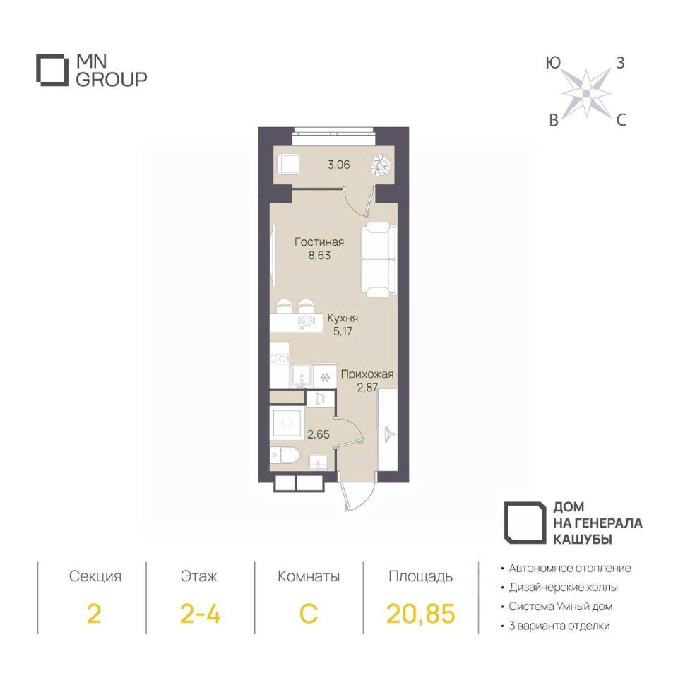 Продается 1-комн. студия комфорт-класса на 4 этаже в клубном доме на Генерала Кашубы