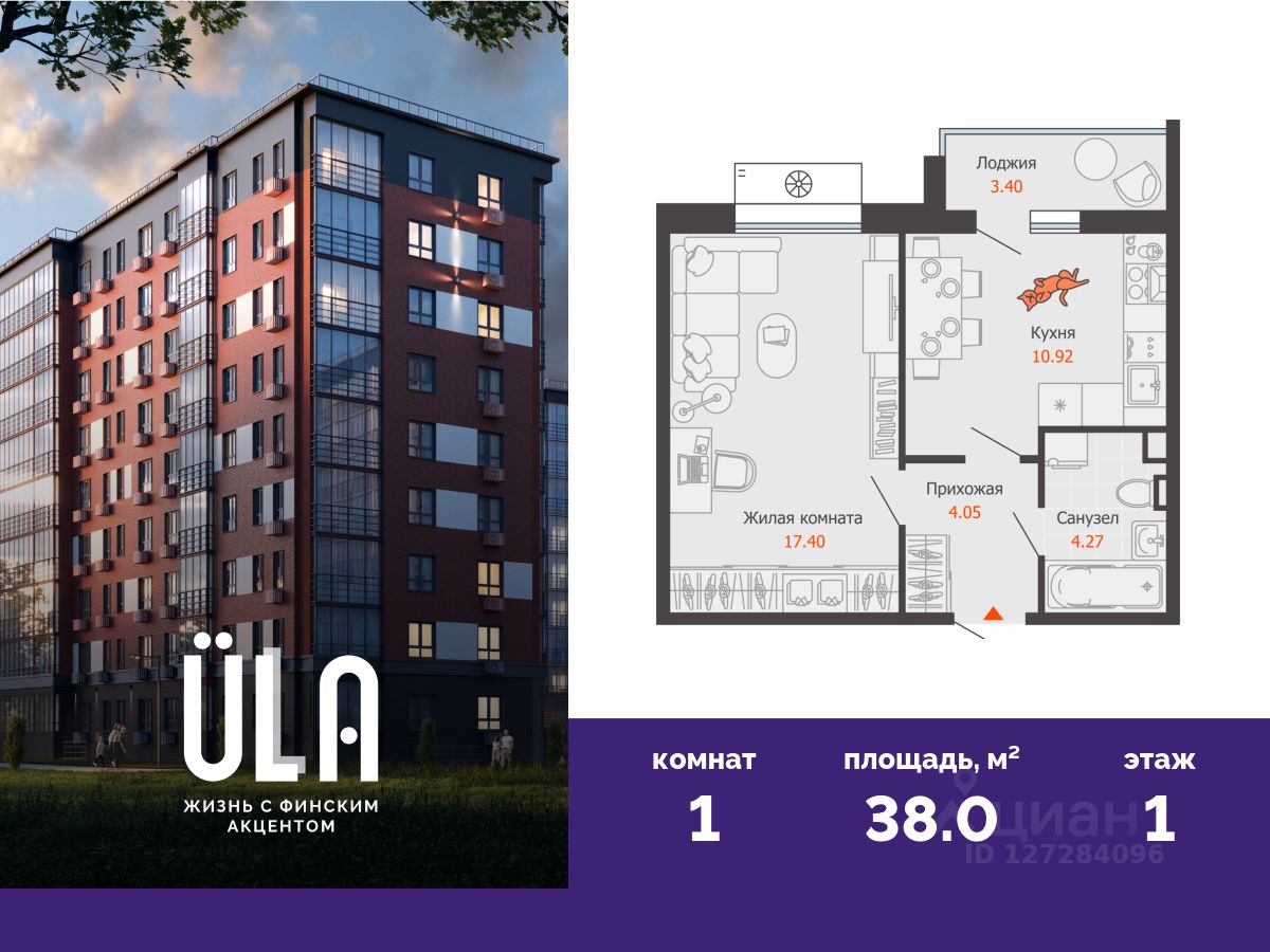В новом доме комфорт-класса продается 1-комнатная квартира площадью 38.00 кв. м . Квартира находится в доме 3 в жилом комплексе ULLA от федерального застройщика "Железно".