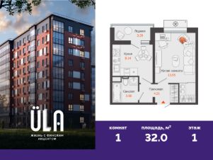 В новом доме комфорт-класса продается 1-комнатная квартира площадью 32.00 кв. м . Квартира находится в доме 3 в жилом комплексе ULLA от федерального застройщика "Железно".