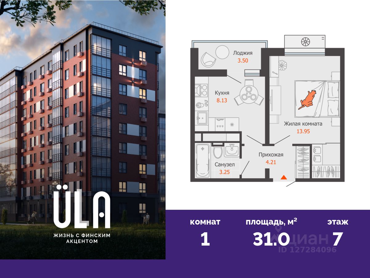 В новом доме комфорт-класса продается 1-комнатная квартира площадью 31.00 кв. м . Квартира находится в доме 3 в жилом комплексе ULLA от федерального застройщика "Железно".