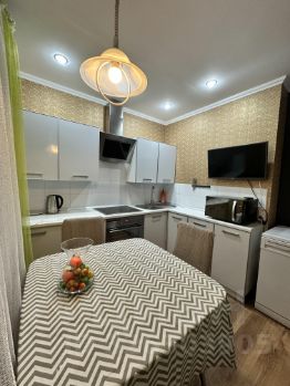 Кухня встроенная: варочная панель, духовой шкаф, вытяжка, посудомоечная машина (в комплекте принадлежности и средства), холодильник, микроволновка, чайник, телевизор. Вся техника полностью исправна, чистая, с документами.